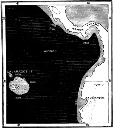 The Galapagos differ in many important respects from the islands we have examined in our last chapter, and the differences are such as to have affected the whole character of their animal inhabitants. Like the Azores, they are volcanic, but they are much more extensive, the islands being both larger and more numerous; while volcanic action has been so recent that a large portion of their surface consists of barren lava-fields. They are considerably less distant from a continent than either the Azores or Bermuda, being about 600 miles from the west coast of South America and a little more than 700 from Veragua, with the small Cocos Islands intervening; and they are situated on the equator instead of being in the north temperate zone. They stand upon a deeply submerged bank, the 1,000 fathom line encircling all the more important islands at a few miles distance, whence there appears to be a comparatively steep descent all round to the average depth of that portion of the Pacific, between 2,000 and 3,000 fathoms.