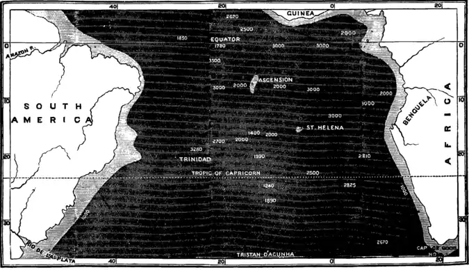 122 ^ On Petermann's map of Africa, in Stieler's Hand-Atlas (1879), the Island of Ascension is shown as seated on a much larger and shallower submarine bank than St. Helena. The 1,000 fathom line round Ascension encloses an oval space 170 miles long by 70 wide, and even the 300 fathom line, one over 60 miles long; and it is therefore probable that a much larger island once occupied this site. Now Ascension is nearly equidistant between St. Helena and Liberia, and such an island might have served as an intermediate station through which many of the immigrants to St. Helena passed. As the distances are hardly greater than in the case of the Azores, this removes whatever difficulty may have been felt of the possibility of any organisms reaching so remote an island. The present island of Ascension is probably only the summit of a huge volcanic mass, and any remnant of the original fauna and flora it might have preserved may have been destroyed by great volcanic eruptions. Mr. Darwin collected some masses of tufa which were found to be mainly organic, containing, besides remains of fresh-water infusoria, the siliceous tissue of plants! In the light of the great extent of the submarine bank on which the island stands, Mr. Darwin's remark, that—"we may feel sure, that at some former epoch, the climate and productions of Ascension were very different from what they are now,"—has received a striking confirmation. (See Naturalist's Voyage Round the World, p. 495.)