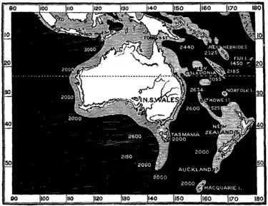 Deductions from the Peculiarities of the New Zealand Fauna.—The total absence (or extreme scarcity) of mammals in New Zealand obliges us to place its union with North Australia and New Guinea at a very remote epoch. We must either go back to a time when Australia itself had not yet received the ancestral forms of its present marsupials and monotremes, or we must suppose that the portion of Australia with which New Zealand was connected was then itself isolated from the mainland, and was thus without a mammalian population. We shall see in our next chapter that there are certain facts in the distribution of plants, no less than in the geological structure of the country, which favour the latter view. But we must on any supposition place the union very far back, to account for the total want of identity between the winged birds of New Zealand and those peculiar to Australia, and a similar want of accordance in the lizards, the fresh-water fishes, and the more important insect-groups of the two countries. From what we know of the long geological duration of the generic types of these groups we must certainly go back to the earlier portion of the Tertiary period at least, in order that there should be such a complete disseverance as exists between the characteristic animals of the two countries; and we must further suppose that, since their separation, there has been no subsequent union or sufficiently near approach to allow of any important intermigration, even of winged birds, between them. It seems probable, therefore, that the Bampton shoal west of New Caledonia, and Lord Howe's Island further south, formed the western limits of that extensive land in which the great wingless birds and other isolated members of the New Zealand fauna were developed. Whether this early land extended eastward to the Chatham Islands and southward to the Macquaries we have no means of ascertaining, but as the intervening sea appears to be not more than about 1,500 fathoms deep it is quite possible that such an amount of subsidence may have occurred. It is possible, too, that there may have been an extension northward to the Kermadec Islands, and even further to the Tonga and Fiji Islands, though this is hardly probable, or we should find more community between their productions and those of New Zealand.