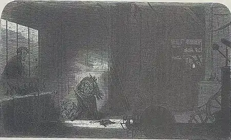 The little counting-house reserved for his own occupation, was a room of wood and glass at the end of a long low workshop, filled with benches, and vices, and tools, and straps, and wheels; which, when they were in gear with the steam-engine, went tearing round as though they had a suicidal mission to grind the business to dust and tear the factory to pieces. A communication of great trap-doors in the floor and roof with the workshop above and the workshop below, made a shaft of light in this perspective, which brought to Clennam’s mind the child’s old picture-book, where similar rays were the witnesses of Abel’s murder. The noises were sufficiently removed and shut out from the counting-house to blend into a busy hum, interspersed with periodical clinks and thumps. The patient figures at work were swarthy with the filings of iron and steel that danced on every bench and bubbled up through every chink in the planking. The workshop was arrived at by a step-ladder from the outer yard below, where it served as a shelter for the large grindstone where tools were sharpened. The whole had at once a fanciful and practical air in Clennam’s eyes, which was a welcome change; and, as often as he raised them from his first work of getting the array of business documents into perfect order, he glanced at these things with a feeling of pleasure in his pursuit that was new to him.