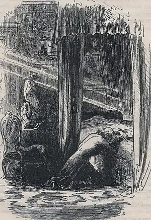 So he went up his grand staircase, slowly, and tired, and looked into various chambers which were empty, until he saw a light in a small ante-room. It was a curtained nook, like a tent, within two other rooms; and it looked warm and bright in colour, as he approached it through the dark avenue they made.