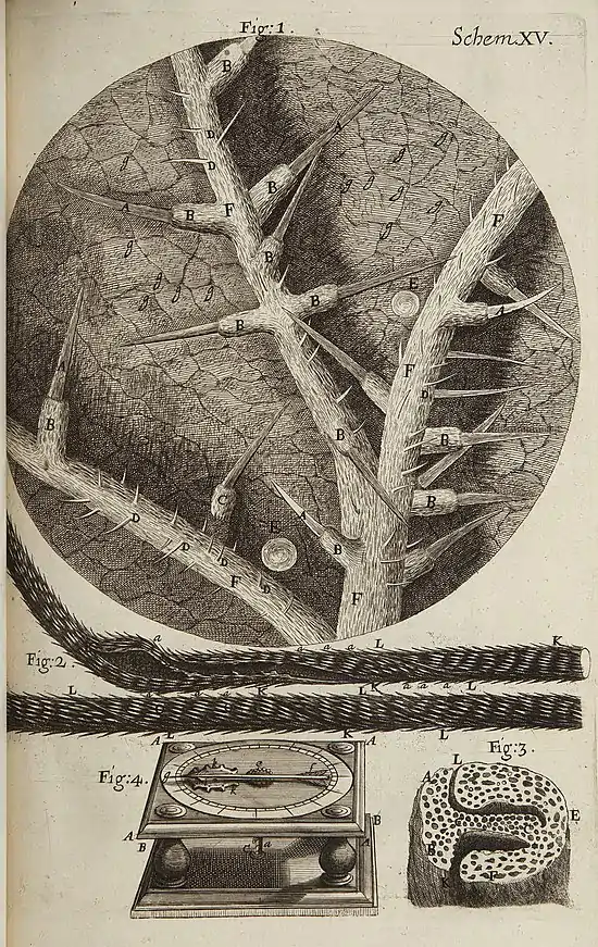 Schem. XV. Microscope with a single Glass which drew about half an Inch, this I had fastned into a little frame, almost like a pair of Spectacles, which I placed before mine eyes, and so holding the leaf of a Nettle at a convenient distance from my eye, I did first, with the thrusting of several of these bristles into my skin, perceive that presently after I had thrust them in I felt the burning pain begin; next I observ'd in divers of them, that upon thrusting my finger against their tops, the Bodkin (if I may so call it) did not in the least bend, but I could perceive moving up and down within it a certain liquor, which upon thrusting the Bodkin against its basis, or bagg B, I could perceive to rise towards the top, and upon taking away my hand, I could see it again subside, and shrink into the bagg; this I did very often, and saw this Phænomenon as plain as I could ever see a parcel of water ascend and descend in a pipe of Glass. But the basis underneath these Bodkins on which they were fast, were made of a more pliable substance, and looked almost like a little bagg of green Leather, or rather resembled the shape and surface of a wilde Cucumber, or cucumeris asinini , and I could plainly perceive them to be certain little baggs, bladders, or receptacles full of water, or as I ghess, the liquor of the Plant, which was poisonous, and those small Bodkins were but the Syringe-pipes, or Glyster-pipes, which first made way into the skin, and then served to convey that poisonous juice, upon the pressing of those little baggs, into the interior and sensible parts of the skin, which being so discharg'd, does corrode, or, as it were, burn that part of the skin it touches; and this pain will sometimes last very long, according as the impression is made deeper or stronger.