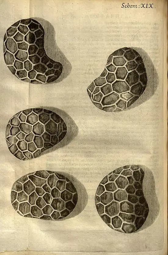 Schem. XX. other microscopical seeds of Vegetables: For first, though they grow in a Case or Hive oftentimes bigger then one of these Pictures of the microscopical appearance, yet are they for the most part so very little, that they exceed not the bulk of a small Nitt, being not above 132part of an Inch in Diameter, whereas the Diameter of the Hive of them oftentimes exceeds two Inches, so that it is capable of containing near two hundred thousand, and so in all likelihood does contain a vast quantity, though perhaps not that number. Next, for their prettiness, they may be compar'd to any microscopical seed I have yet seen; for they are of a dark brownish red colour, curiously Honey-comb'd all over with a very pretty variety of Net-work, or a small kind of imbosment of very orderly rais'd ridges, the surface of them looking not unlike the inside of a Beev's stomack. But that which makes it most considerable of all, is, the medicinal virtues of it, which are such as are not afforded us by any Mineral preparation; and that is for the procuring of sleep, a thing as necessary to the well-being of a creature as his meat, and that which refreshes both the voluntary and rational faculties, which, whil'st this affection has seis'd the body, are for the most part unmov'd, and at rest. And, methinks, Nature does seem to hint some very notable virtue or excellency in this Plant from the curiosity it has bestow'd upon it. First, in its flower, it is of the highest scarlet-Dye, which is indeed the prime and chiefest colour, and has been in all Ages of the world most highly esteem'd: Next, it has as much curiosity shew'd also in the husk or case of the seed, as any one Plant I have yet met withall; and thirdly, the very seeds themselves, the Microscope discovers to be very curiously shap'd bodies; and lastly, Nature has taken such abundant care for the propagation of it, that one single seed grown into a Plant, is capable of bringing some hundred thousands of seeds.