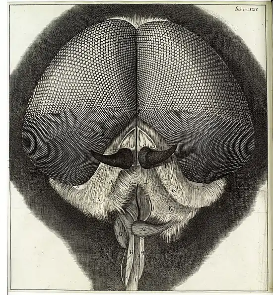 Whil’st I was examining and considering the curious Mechanism of the wings, I observ’d that under the wings of most kind of Flies, Bees, &c. there were plac’d certain pendulums or extended drops (as I may so call them from their resembling motion and figure) for they much resembled a long hanging drop of some transparent viscous liquor; and I observed them constantly to move just before the wings of the Fly began to move, so that at the first sight I could not but ghess, that there was some excellent use, as to the regulation of the motion of the wing, and did phancy, that it might be something like the handle of a Cock, which by vibrating to and fro, might, as ’twere, open and shut the Cock, and thereby give a passage to the determinate influences into the Muscles; afterwards, upon some other trials, I suppos’d that they might be for some use in respiration, which for many reasons I suppose those Animals to use, and, me thought, it was not very improbable, but that they might have convenient passages under the wings for the emitting, at least, of the air, if not admitting, as in the gills of Fishes is most evident; or, perhaps, this Pendulum might be somewhat like the staff to a Pump, whereby these creatures might exercise their Analogus lungs, and not only draw in, but force out, the air they live by: but these were but conjectures, and upon further examination seem’d less probable.