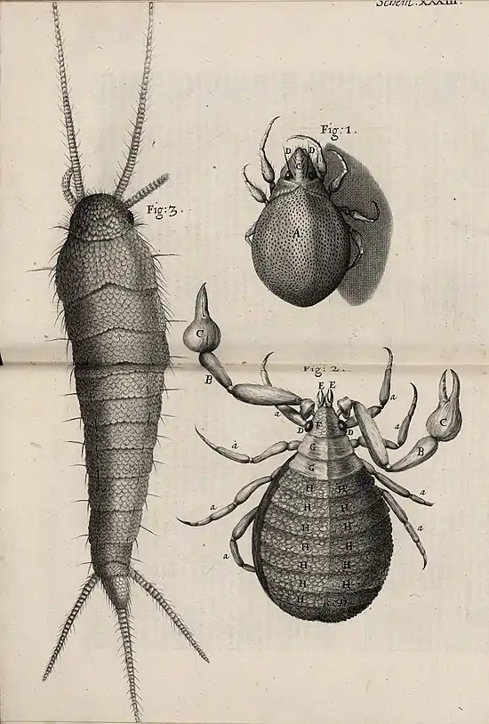 These Creatures to the naked eye seemed to be a kind of black Mite, but much nimbler and stronger then the ordinary Cheese-Mites; but examining them in a Microscope, I found them to be a very fine crusted or shell'd Insect, much like that represented in the first Figure of the three and thirtieth Scheme, with a protuberant oval shell A, indented or pitted with an abundance of small pits, all covered over with little white brisles, whose points all directed backwards.