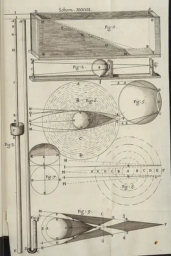 This I should further proceed to hope[errata 2], had any one been so inquisitive as to have found out the way of making any transparent body, either more dense or more rare, for then it might be possible to compose a Globule that should be more dense in the middle of it, then in any other part, and to compose the whole bulk, so as that there should be a continual gradual transition from one degree of density to another; such as should be found requisite for the desired inflection of the transmigrating Rays; but of this enough at present, because I may say more of it when I set down my own Trials concerning the melioration of Dioptricks, where I shall enumerate with how many several substances I have made both Microscopes, and Telescopes, and by what and how many, ways: Let such as have leisure and opportunity farther consider it.