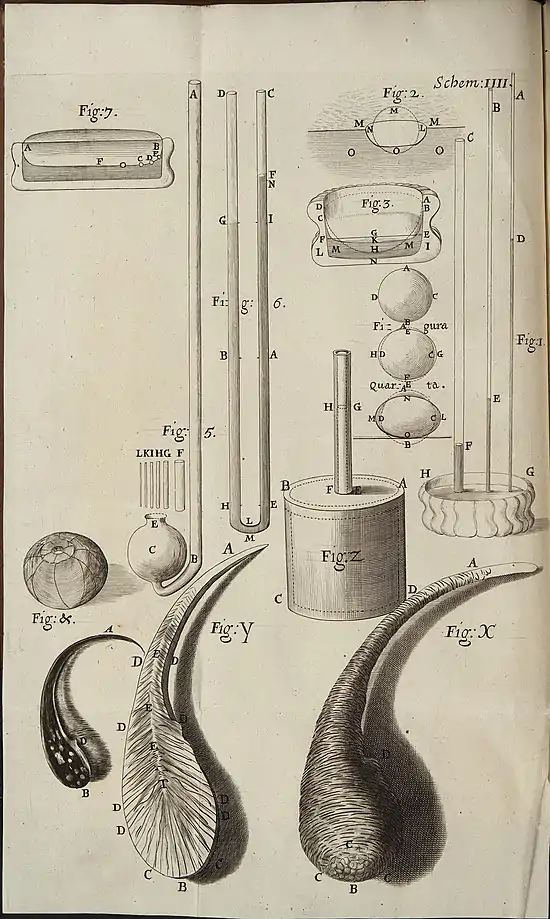 Schem. IIII. most Objects, by reason of their smalness,3. The difficulty of finding the desired point, and of placing it so, as to reflect the light conveniently for the Inquiry. Lastly, ones being able to view it but with one eye at once, they will appear no small obstructions, nor are they easily remov'd without many contrivances. But to proceed, I could not find that water, or some deeply ting'd liquors would in small ones rise so high as one would expect; and the highest I have found it yet rise in any of the pipes I have try'd, was to 21 inches above the level of the water in the vessel: for though I found that in the small pipes it would nimbly enter at first, and run about 6 or 7 inches upwards; yet I found it then to move upwards so slow, that I have not yet had the patience to observe it above that height of 21 inches (and that was in a pretty large Pipe, in comparison of those I formerly mentioned; for I could observe the progress of a very deep ting'd liquor in it with my naked eye, without much trouble; whereas many of the other pipes were so very small, that unless in a convenient posture to the light, I could not perceive them:) But 'tis very probable, that a greater patience and assiduity may discover the liquors to rise, at least to remain suspended, at heights that I should be loath now even to ghess at, if at least there be any proportion kept between the height of the ascending liquor, and the bigness of the holes of the pipes.