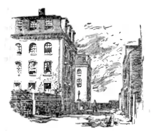 In the same neighborhood was a short street of unsavory reputation, partly on account of a murder committed within its limits many years before, and partly because it held the city morgue. Hardly realizing where she was, Miss Theodora one day was picking her way along the slippery sidewalk, with Kate closely following, when something dark crossed their path. They stopped to make way for it. It was a grim, indefinite something, which two men had lifted from a wagon to carry into a neighboring building—a something whose resemblance to a human body was not concealed by the dark green cloth covering it. Then they knew that they were near the morgue; and while the elder woman was regretting that she had brought Kate with her, she heard a voice speak her name, and, turning, saw Ben Bruce but a few steps behind.