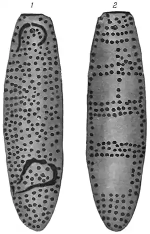 FIG. 40.—THE NAKRANG-GA BULL-ROARER. 1 AND 2 ARE OPPOSITE SIDES. ×½ was punished with death, both of the person who showed it and the person to whom it was shown.[52]