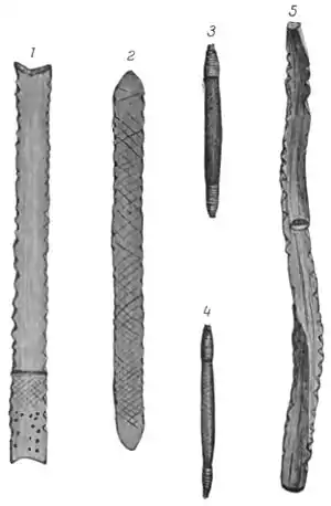 FIG. 43.—MESSAGE-STICKS OF WURUNJERRI, NARRINYERI, GOURNDITCH-MARA, AND WOTJOBALUK TRIBES. ×⅔. those who join him in sending the message. A large notch is made on one side for each tribal group which is invited to attend. If all the people are invited to attend, then the stick is notched from end to end. If very few are invited, a notch is made for each individual, as he is named to the messenger. The illustration, Fig. 43, No. 5, represents one of these sticks, which was made to convey an invitation from the Headman of the Gromilluk horde to the Yarik-kulluk horde at Lake Coorong, both being local divisions of the Wotjobaluk tribe. All the people were invited to attend. The three notches at the upper end on the right-hand side show the sender and his friends, who were the principal Gromilluk men. The large notch represents the Yarik-killuk horde and its Headman, to whom the message was sent. The notches continuing along the edge to the end and along the other edge indicate all the people of the horde being invited.