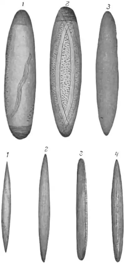 FIG. 21.—NOS. 1 AND 2 IN THE UPPER ROW ARE OPPOSITE SIDES OF A GULIWIL OF THE WOTJOBALUK TRIBE. NO. 3 IN THE UPPER LINE AND ALL THOSE IN THE LOWER LINE ARE GULIWILS. adding, 'You need not deny it, he has dreamed of it three times, and dreams are generally true.' Sometimes the suspected Bangal (medicine-man), seeing no other way out of it, admits that he has something that he is burning, but makes the excuse that it was given to him to burn, and that he did not know to whom it belonged. In such a case he would give the thing to the friends of the sick man, telling them to put it in water to put the fire out; and when this had been done, the man would probably feel better."