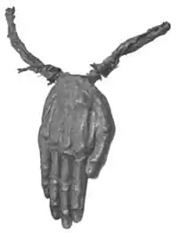 The belief is that Brewin has filled the sufferer's chest with the frayed fibres of the stringy-bark tree, called Tundung, by means of the hooked end of his spear-thrower. This hooked end is called the eye, Mri.