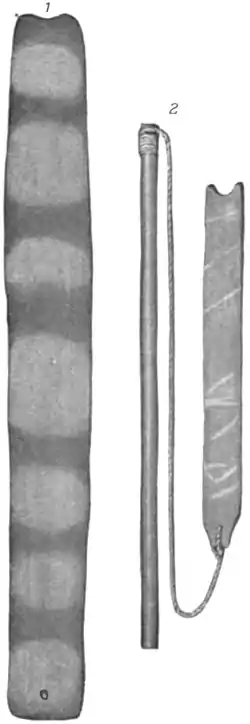 FIG. 29.—1. YUIN BULL-ROARER, MUDTHI; 2. DIERI BULL-ROARER, YUNTHA. who lived at Twofold Bay, should come up to Manero with some of his men and meet me on the occasion of my next visit to that part of New South Wales. At this meeting, amongst other things, we discussed the advisability of holding a Kuringal, and it was at last decided that one should be held. I was greatly struck by the manner in which the old man received a bull-roarer which I had made for the occasion, it being the facsimile of those with which I had played as a boy. I drew it from a small bag and secretly presented it to him, saying: "This I used when I was a lad, and you know that these mudthi were first made by that great one (pointing upwards), and that he ordered your fathers to hold the Kuringal, and to make your boys into men." He and Yibai, who was standing by him, each placed his hand over his mouth, and looked at the bull-roarer for some moments. Then the Yuin Gommera Brupin said: " Yes, that is it," and he called the three men whom he had brought with him, and holding the bull-roarer before him said: "This is a mudthi which he (pointing to me) has brought from a long way off. It is the same as that which we know of, and which was given to our fathers by that great Biamban you know about." The men looked at it with every appearance of awe, but said nothing, and then returned to their fire.