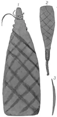 - ↑ These staves should properly have been "yam-sticks," but these implements are no longer used by the Kurnai, flour having replaced the former food of roots or tubers. The bunches of leaves which play a part in these ceremonies are called "Jerung"—branches, boughs, or twigs.