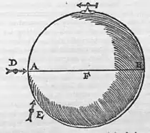 On the stone A B the versorium is placed in such a way that the versorium may remain in equilibrium: you will mark with chalk the course of the iron when at rest: Move the instrument to another spot, and again make note of the direction and aspect: do the same thing in several places, and from the concurrence of the lines of direction you will find one pole at the point A, the other at B. A versorium placed near the stone also indicates the true pole; when at right angles it eagerly beholds the stone and seeks the pole itself directly, and is turned in a straight line through the axis to the centre of the stone. For instance, the versorium D faces toward A and F, the pole and centre, whereas E does not exactly respect * either the pole A or the centre F[64]. A bit of rather fine iron wire, of the length of a barley-corn, is placed on the stone, and is moved over the regions and surface of the stone, until it rises to the perpendicular[65]: for it stands erect at the actual pole, whether Boreal or austral; the further from the pole, the more it inclines from the vertical. The poles thus found you shall mark with a sharp file or gimlet.