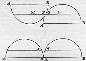 A spherical stone is divided into two equal parts along the axis A B; * whether therefore the surface A B is in the one part facing upward (as in the former diagram) or lying on its face in both parts (as in * the latter), the end A tends toward B. But it must also be understood that the point A is not carried with a definite aim always toward the point B, because in consequence of the division the verticity proceeds to other points, as to F G, as appears in the fourteenth chapter of this book. And L M are now the axes in each, and A B is no longer the axis; for magnetick bodies, as soon as they are divided, become single magnetick wholes; and they have vertices in accordance with their mass, new poles arising at each end in consequence of the division. Yet the axis and the poles always follow the leading of a meridian; because that force passes along the meridians of the stone from the æquator to the poles, by an everlasting rule, the inborn virtue of the substance agreeing thereto from the long and lasting position and the facing of a suitable substance toward the poles of the earth; by whose strength continued through many centuries it has been fashioned; toward fixed and determined parts of which it has remained since its origin firmly and constantly turned.