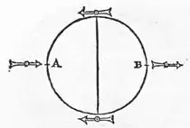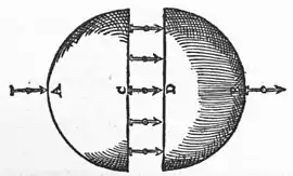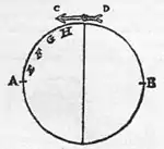 A round stone (or terrella) cut in two at the æquator; and all the cusps have been touched by the pole A. The points at the centre of the earth, and between the two parts of the terrella which has been cut in two through the plane of the æquator, are directed as in the present[209] diagram. This would also happen in the same way if the division of the stone were through the plane of a tropick, and the mutual separation of the divided parts and the interval between them were the same as before, when the loadstone was divided through the plane of the æquator, and the parts separated. For the cusps are repelled by C, are attracted by D; and the versoria are parallel, the poles or the verticity in both ends mutually requiring it.