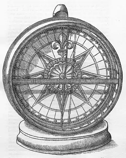 Now how much it dips at every horizon may be ascertained in the first place by a contrivance, which, however, is not so easily made as is that in dials for measuring time, in which the needle turns to the points of the horizon, or in the mariners' compass. From a plank of wood let a smooth and circular instrument be prepared, at least six digits in diameter, and affix this to the side of a square pillar, which stands upright on a wooden base. Divide the periphery of this instrument into 4 quadrants: then each quadrant into 90 degrees. At the centre of the instrument let there be placed a brass peg, at the centre of the end of which let there be a small hollow, well polished. To this wooden instrument let a brass circle or ring be fixed, about two digits in width, with a thin plate or flat rod of the same metal, representing the horizon, fixed across it, through the middle of the circle. In the middle of the horizontal rod let there be another hollow, which shall be exactly opposite the centre of the instrument, where the former hollow was made. Afterward let a needle be fashioned out of steel, as versoria are accustomed to be made. Divide this at right angles by a thin iron axis (like a cross) through the very middle and centre of the wire and the cross-piece. Let this dipping-needle be hung (with the ends of the cross resting in the aforesaid holes) so that it can move freely and evenly on its axis in the most perfect æquilibrium, so accurately that it turns away from no one point or degree marked on the circumference more than from another, but that it can rest quite easily at any. Let it be fixed upright to the front part of the pillar, whilst at the edge of the base is a small versorium to show direction. Afterward touch the iron, suspended by this ingenious method, on both ends with the opposite ends of a loadstone, according to the scientifick method, but rather carefully, lest the needle be twisted in any way; for unless you prepare everything very skilfully and cleverly, you will secure no result. Then let another brass ring be prepared, a little larger, so as to contain the former one; and let a glass or a very thin plate of mica be fitted to one side of it. When this is put over the former ring, the whole space within remains inclosed, and the versorium is not interfered with by dust or winds. Dispose the instrument, thus completed, perpendicularly on its base, and with the small versorium horizontal, in such a way that, while standing perpendicularly, it may be directed toward the exact magnetical point respective. Then the end of the needle which looks toward the north dips below the horizon in northern regions, whilst in southern regions the end of the needle which looks toward the south tends toward the centre of the earth, in a certain proportion (to be explained afterward) to the latitude of the district in question, from the æquator on either side. The needle, however, must be rubbed on a powerful loadstone; otherwise it does not dip to the true point, or else it goes past it, and does not always rest in it. A larger instrument may also be used, whose diameter may be 10 or 12 digits; but in such an instrument more care is needed to balance the versorium truly. Care must be taken that the needle be of steel; also that it be straight; likewise that both ends of the cross-piece be sharp and fixed at right angles to the needle, and that the cross-piece pass through the centre of the needle. As in other magnetical motions there is an exact agreement between the earth and the stone, and a correspondence manifestly apparent to our senses by means of our experiments; so in this declination there is a clear and evident concordance of the terrestrial globe with the loadstone. Of this motion, so important and so long unknown to all men, the following is the sure and true cause. A magnet-stone is moved and turned round until one of its poles being impelled toward the north comes to rest toward a definite point of the horizon. [231]This pole, which settles toward the north (as appears from the preceding rules and demonstrations), is the southern, not the boreal; though all before us deemed it to be the boreal, on account of its turning to that point of the horizon. A wire or versorium touched on this pole of the stone turns to the south, and is made into a boreal pole, because it was touched by the southern terminal of the stone. So if the cusp of a versorium be excited in a similar manner, it will be directed toward the southern pole of the earth, and will adjust itself also to it; but the cross (the other end) will be southern, and will turn to the north of the earth (the earth itself being the cause of its motion); for so direction is produced from the disposition of the stone or of the excited iron, and from the verticity of the earth. But declination takes place when a magnetick is turned round toward the body of the earth, with its southern end toward the north, at some latitude away from the æquator. For this is certain and constant, that exactly under the cœlestial æquator, or rather over the æquator of the terrestrial globe, there is no declination of a loadstone or of iron; but in whatever way the iron has been excited or rubbed, it settles in the declination instrument precisely along the plane of the horizon, if it were properly balanced before. Now this occurs thus because, when the magnetick body is at an equal distance from either pole, it dips toward neither by its own versatory nature, but remains evenly directed to the level of the horizon, as if it were resting on a pin or floating free and unhindered on water. But when the magnetick substance is at some latitude away from the æquator, or when either pole of the earth is raised (I do not say raised above the visible horizon, as the commonly imagined pole of the revolving universe in the sky, but above the horizon or its centre, or its proper diameter, æquidistant from the plane of the visible horizon, which