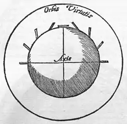 The declination of a magnetick needle above a terrella is shown by means of several equal iron wires, of the length of a barleycorn, arranged along a meridian. The wires on the æquator are directed by the virtue of the stone toward the poles, and lie down upon its body along the plane of its horizon. The nearer they are brought to the poles, the more they are raised up by their versatory nature. At the poles themselves they point perpendicularly toward the very centre. But iron spikes, if they are of more than a due length, are not raised straight up except on a vigorous stone.