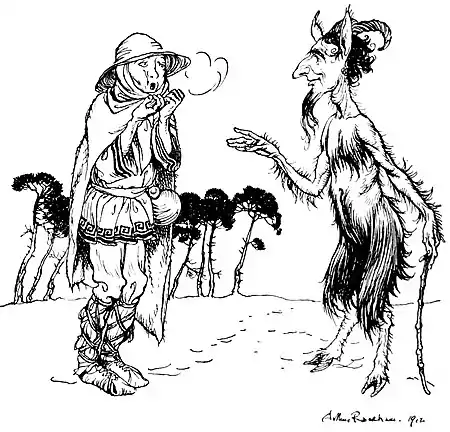 A MAN and a Satyr became friends, and determined to live together. All went well for a while, until one day in winter-time the Satyr saw the Man blowing on his hands. “Why do you do that?” he asked. “To warm my hands,” said the Man. That same day, when they sat down to supper together, they each had a steaming86