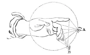 - ↑ The eyeball moving up and down to look at the hand, describes a part of a circle, from every point of which it sees it in an infinite variety of aspects. The hand also is moveable ad infinitum (for it can go round the whole circle—see chap. lxxxvii.), and consequently shew itself in an infinite variety of aspects, which it is impossible for any memory to retain.