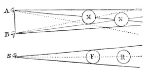 The reason is this. The two eyes A B looking at objects one behind another, as M and N, see them both; because M cannot entirely occupy the space of N, by reason that the base of the visual rays is so broad, that the second object is seen behind the first. But if one eye be shut, and you look with the other S, the body F will entirely cover the body R, because the visual rays beginning at one point, form a triangle, of which the body F is the base, and being prolonged, they form two diverging tangents at the two extremities of F, which cannot touch the body R behind it, therefore can never see it [1].