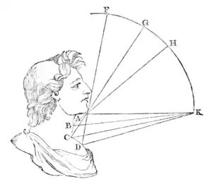 For instance, the recess A receives no light from any part of the sky G K, but B begins to receive the light from the part of the sky H K, and C from G K; and the point D receives the whole of F K. Therefore the chest will be as light as the forehead, nose, and chin. But what I have particularly to recommend, in regard to faces, is, that you observe well those different qualities of shades which are lost at different distances (while there remain only the first and principal spots or strokes of shades, such as those of the sockets of the eyes, and other similar recesses, which are always dark), and at last the whole face becomes obscured; because the greatest lights (being small in proportion to the demi-tints) are lost. The quality, therefore, and quantity of the principal