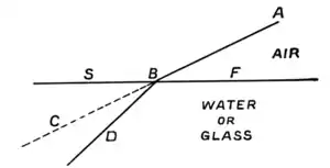In Fig. 24 the beam of light AB goes along straight from A to B, and then strikes SF, the surface of glass or water; thereupon instead of continuing straight along BC it is "broken back," or is refracted along BD.