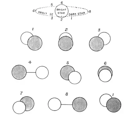 This star behaves like the light of some lighthouses, it shines steadily for a time and then goes faint. The steady shining lasts for about three days and then comes the dip. Now the eye is able to see this without any telescope at all; and we can interpret the dip to mean that something comes in front of the light. Imagine two