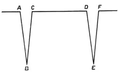 cause. And now I want to show you what beautiful results he obtained. We may represent what the eye saw by the diagram of Fig. 34. The time when the light is steady is represented by the horizontal lines like CD and FG: the eclipses by the sudden drops ABC and DEF. But the first thing found by the selenium photometer was that in the middle of the straight portions (or what had been thought to be straight portions) there was another little drop so small that the eye had overlooked it. What does this mean?
