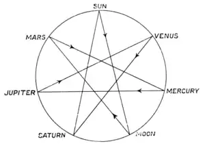 but they could easily observe which of them moved most slowly and which most quickly. They put them in the order of speed, beginning with Saturn, the slowest, then Jupiter, Mars, the Sun, Venus, Mercury, and the Moon, which moves quickest of all (see Fig. 43). The old astrologers then assigned each planet influence for an hour; Saturn started with the first hour of his day, followed by Jupiter for the second hour, Mars for the third, and so on. When all seven planets had been used up, Saturn's turn came round again, and in the first 21 hours of the 24 all the planets