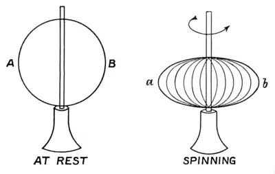let us first do one or two more experiments. In Fig. 46 is a hoop, or rather a pair of hoops, which when at rest are circular, but flatten down as in Fig. 47 when they are spun, because the outer portions AB tend to fly away from the axis; you can easily see that in the second figure they are farther from the axis in the positions ab than in the first figure. The hoops are strong enough to hold together however fast we spin them in this case; but you must remember that I am not very strong and cannot spin very fast. If