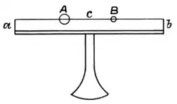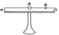Here is a big ball A and a little one B tied together (Fig. 48), and both are sliding on the same wire. If we put them at equal distances from the centre C and then spin the apparatus, the big ball immediately flies to the end a, pulling the little one with it. But if we put A at the centre (Fig. 49) and spin again, the little one flies to its end b and pulls the big one. If we are to get a proper balance we must put the big one, not at the centre, but certainly nearer than the