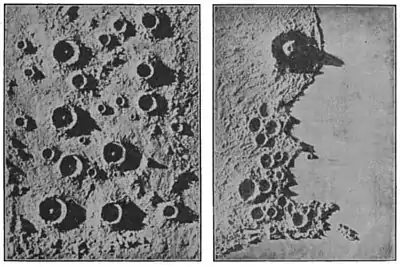 the Moon's surface, with a model of the neighbourhood of Vesuvius alongside it, so that we can compare the two. You see that on the whole the Earth's mountains are distinctly smaller than those on the Moon. One reason for this is that our mountains are being continually washed away by the rain which falls on them, so that they are smaller now-a-days than they used to be. On the Moon there is no rain, and so the mountains remain unwashed.