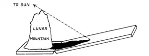 We can see that by a little experiment. Here is a rough model of a lunar mountain attached to a flat board, and from the lantern, which represents the Sun, we will cast a shadow on the board. But now the board is made up of two pieces hinged together, and if I slope the outer piece a little, you will see how the shadow alters in length; I can lengthen it or shorten it by a very slight inclination of the hinged piece (Figs. 55 and 56). I can, of course, see that I am sloping the board, and make due allowance; but on the Moon we do not know whether the plain is flat or not, so that when we measure heights in this way, we are liable to some uncertainties. The case is not