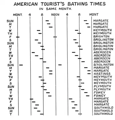 But now suppose the series of marks is, owing to some cause or other, broken up. For instance, suppose that, instead of stopping at one place, you travel about to different places. Then the diagram would be altered as in Fig. 72, which I call the "American Tourist's Bathing Timetable," because