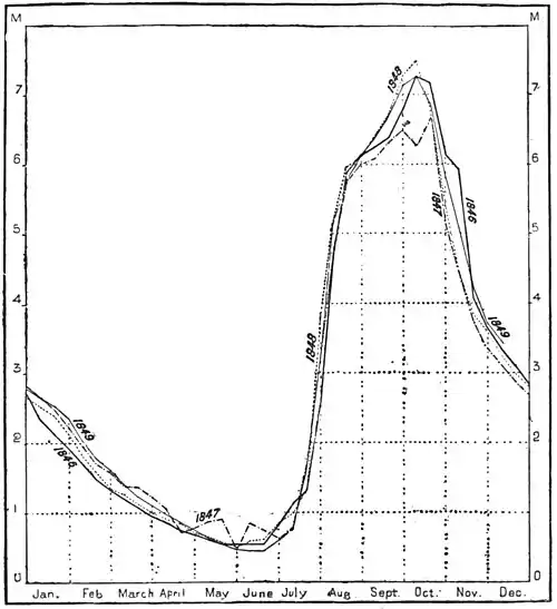 found to coincide with those published by the naturalists of the French expedition, and with the uninterrupted series of modern observations. At the same time the floods oscillate within certain extreme limits. Sometimes there is insufficient water to supply all the canals, while in other years the overflow is excessive, and on these occasions the land does not dry soon enough to insure good harvests.
