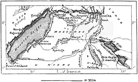 The Wa-Nyoro are a smaller people than their Wa-Ganda neighbours, to whom they also appear to be inferior in physical strength and intelligence, but not in the art of forging and pottery. They belong to the same race, and speak an allied Bantu dialect, but are of a lighter complexion, usually a dull red, and the hair is crisp rather than woolly. Although of cleanly habits, never failing to wash their hands before and after meals, their huts are badly kept, and constructed mostly of branches planted round a stake, and converging upwards so as to form a regular cone. Their only domestic animals are cows, goats, and a poor breed of poultry. In case of distemper these animals are treated by bleeding, and the blood