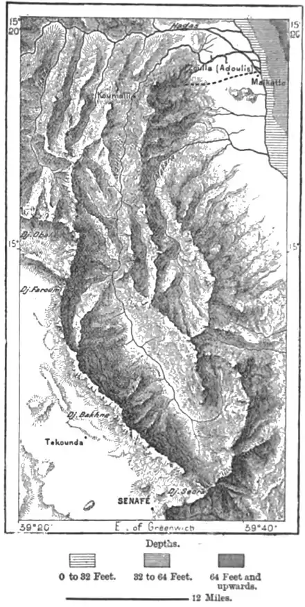 Senafeh, a town situated still farther north, occupies a sheltered Position at the foot of precipitous rocks. As the first mountain station un the route followed by the English army to rescue the prisoners in the hands of Theodore, the camp of Senafeh, during the campaign of 1868, was one of the greatest strategic importance. When the English carriage road, from Adulis Buy to Senafeh through the gorges of Kumaïli is repaired, this village will probably become a flourishing city. To the west Halaï, or the "ascent," which was till recently entirely Catholic, and Digsa (Digsan) are the first upland towns on either branch of the river Hadas, and have also gained a place in the history of Abyssinian exploration.