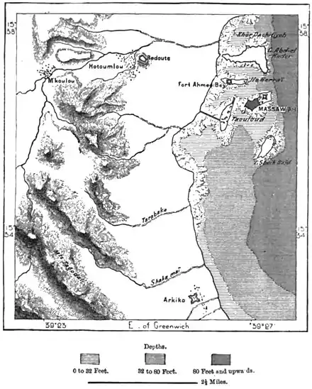 completely free to the trade of Abyssinia. This port of the Red Sea is therefore, if not politically at least commercially, more than ever a natural dependency of Abyssinia, and its importance, already considerable, cannot fail to increase rapidly if peace is maintained on the plateaux. Detached forts command the approaches of the town and mark the limits of an intrenched camp in which the Egyptian governor formerly maintained a corps of 3,000 troops.