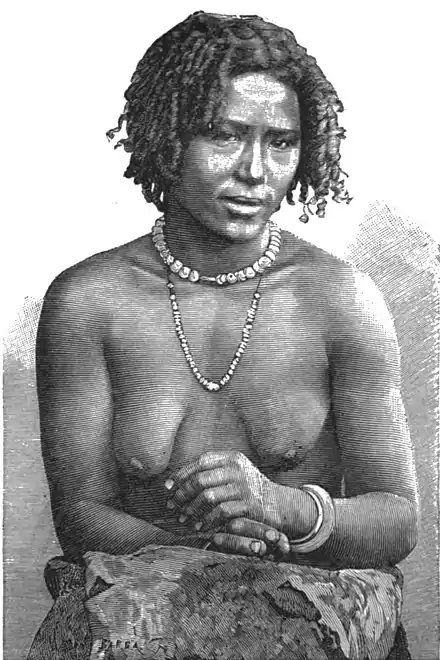 Nile, the "Sons of Men" are very skilful in dressing their hair in the shape of a crescent, a halo, or in long tresses; but the right to these decorations is limited in many tribes to those who have killed a man, under penalty of having it shaved off every three months. The skin varies greatly in shade; whilst that of the men is of a deep or reddish brown, that of the women is usually very light. The.latter are all considered, even by white people, to be very handsome in their youth. According to Beke, the complexion of the Gallas along the Abaï or Blue Nile Valley is not darker than that of the Andalusian peasantry. It was due to their relatively fair