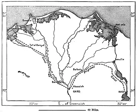 to tow the vessels from one side to the other. As a highway of navigation, the inferiority of this canal, winding through Lower Egypt, compared with that across the isthmus, dispensing with sluices and nearly three times shorter, is self-evident. But the primary object of this canal, which would have been 240 miles long, was the irrigation of the delta rather than traffic. The interests of navigation and irrigation however being different, and even antagonistic, seeing that shipping requires a low level, while cultivators naturally seek to raise the bed of their artificial streams as high as possible, it would be a mistake to construct a canal