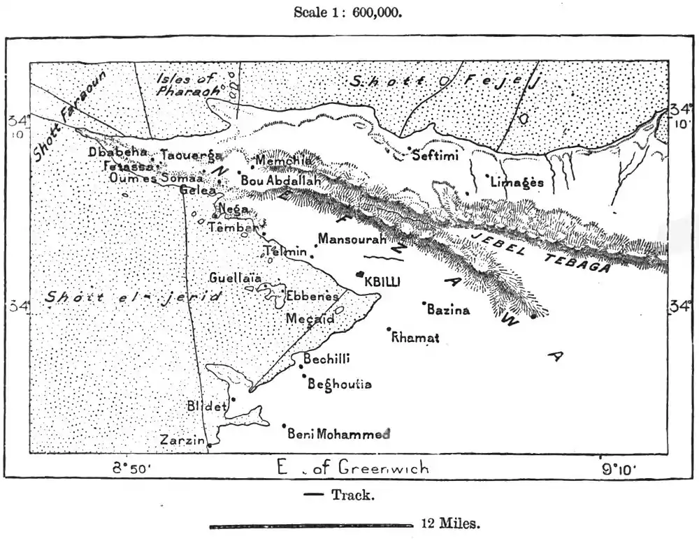 West of Nefzawa, on the other side of the Sebkha-el-Faraun, rise the hills of the narrow isthmus which is known by the special name of Belad-el-Jerid, "Country of Palms," or merely as Jerid, i.e. "The Palm Grove." a designation often extended to the whole region of the southern oases. The Jerid is, in fact, pre-eminently the date country. Surrounded as it is by shotts and sands, and protected from the north wind by the mountains which rise to the north-east, the Jerid undoubtedly possesses that "fiery air"? which is so essential to the life of the palm. Thanks to its abundant springs, it can supply these trees with all the moisture they require; while the water, slightly warmer in temperature than the atmosphere,