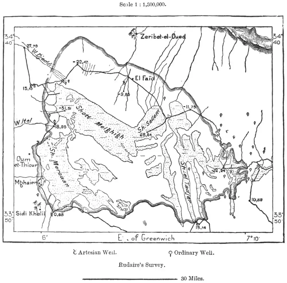 The great Algerian shott and surrounding saline depressions lie below sealevel, whence the hasty conclusion that by connecting them with the Gulf of Cabes, the Sahara itself might be converted into a vast inland sea. Recent measurements have shown that the area of the whole region lying at a lower level than the Mediterranean scarcely exceeds 8,300 miles. Hence the idea of flooding the Suhara, advocated especially by Rudaire, can never be realised in our days.