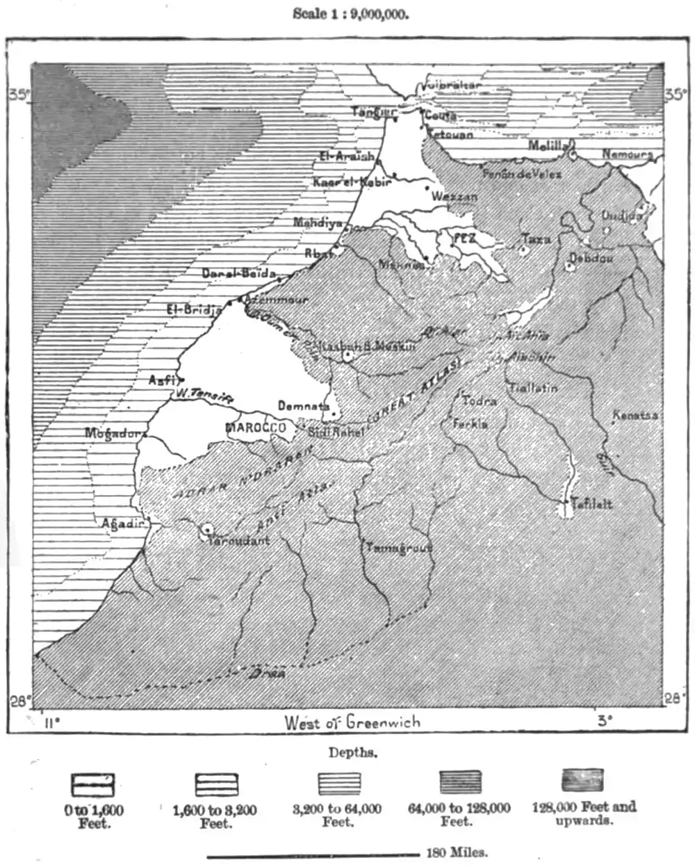 Amongst the districts that have hitherto been scarcely visited is the Rif coast, which is nevertheless yearly skirted by thousands of ships plying east of the Strait of Gibraltar. Even on the direct route between Fez and Marocco, many hilly tracts are known only from the reports of the natives. The Atlas, the Anti-Atlas,