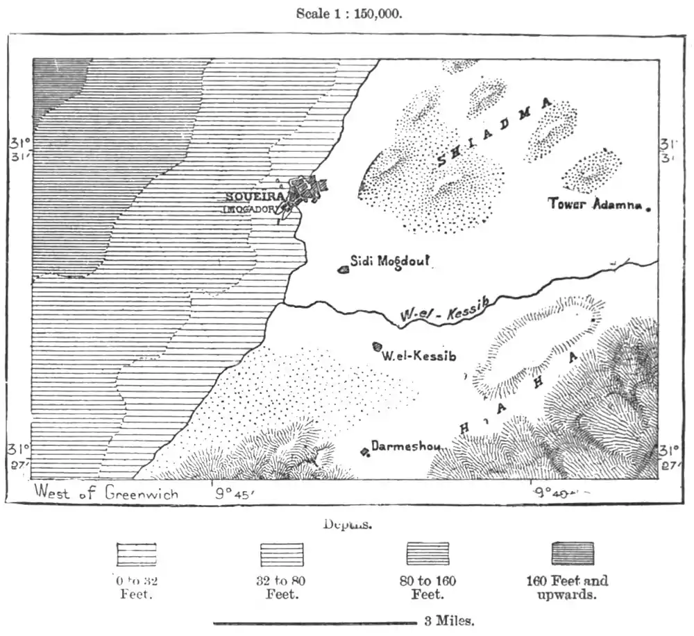 square form, flanked at two angles with high towers, and enclosed by a ditch. The ground floor is occupied by the cattle, while the upper story, approached by a ladder which may be removed in time of danger, is disposed in as many chambers as there are families in the stronghold. Such are the means devised for their mutual protection by the local Haha Berbers, who are settled agriculturists exposed to the raids of the nomad Saharian Arabs, They, however, in their turn occasionally full on passing caravans, so that traders never venture to enter their territory unarmed or in small bodies. The various idan, or clans, constituting