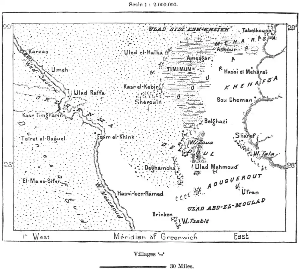 The inhabitants of Gurara, a name by which is more specially understood the district lying north and east of the sebkha, belong for the most part to the Zenata branch of the Berber race. The Meharsa tribe, however, which occupies the northern oasis of Tin-er-Kûk, is of Arab descent, and families of the Ulâd Sidi Sheikh confederacy frequently pitch their tents in this oasis round about the palm groves of the town of Tabelkusa.