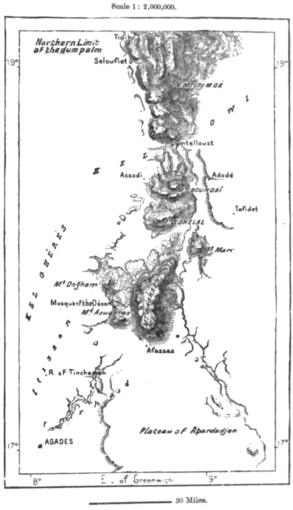 Tintellust is surpassed in population by two other places in Air: to the southeast Tafidet, a group of three villages, one of which is the residence of a prince enjoying a high reputation for sanctity; and to the south-west Assodi, which is said to have been formerly a very large town, containing about a thousand houses and seven mosques, At present scarcely more than eighty of its houses are inhabited.