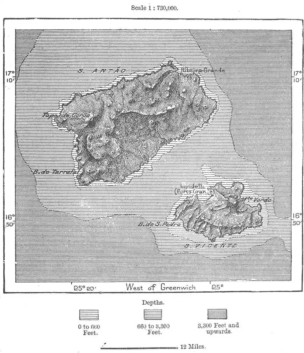 except blackish rocks, red clays, and white pumice scoring the hillsides like streaks of snow. Volcanic cones with craters are dotted all over the island as thickly as on the flanks of Mount Etna. Over twenty are visible to ships rounding the north-east cape to enter the port of Saint Vincent. The main range terminates westwards in the Topo da Coram, the culminating point of the island, with a crater on its summit, according to the marine charts 7,520 feet high. Its flanks are scored right and left by deep ravines, and on the west side it falls abruptly