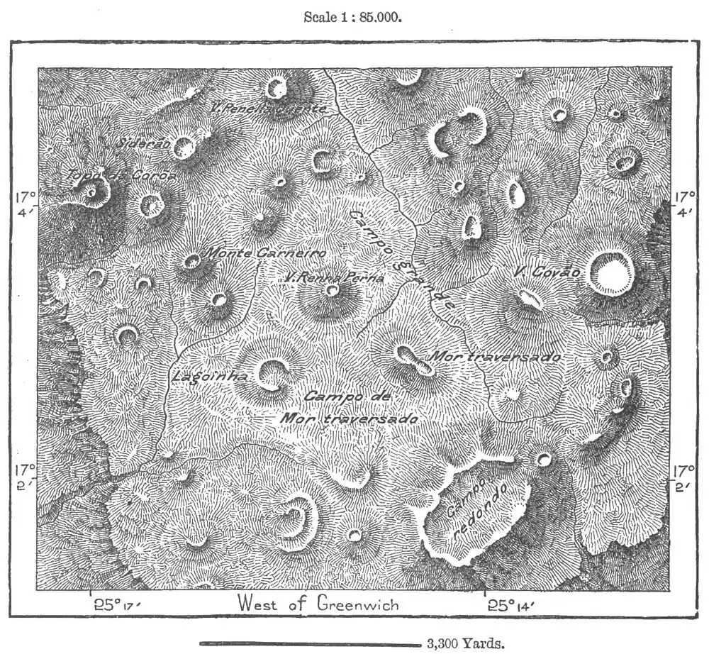 down to the sea. But eastwards it towers above a vast plateau which has a mean altitude of 5,450 feet, and which is covered with volcanic cones, some isolated, some disposed in groups or chains, some with perfect circular or oval "caldrons," others rent and torn on one side and presenting the so-called "spoon" or "ladle" formation. Doelter, the geologist, regards this upland plain as an old bed of a vast crater, where the Topo da Coram represents the _ Vesuvius of a great circular Somma, of which the jagged outlines may still be traced.